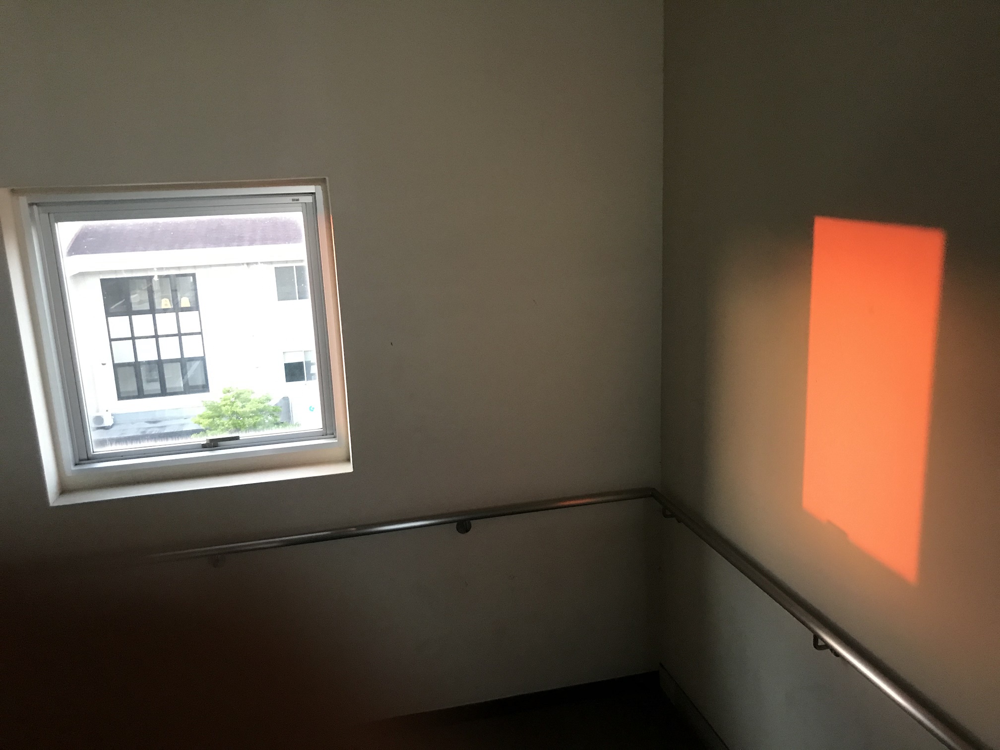 これは、青陵高校の階段での1枚です。ちょうど夕日がきれいな日で、差し込んだ光が壁面に投影されていました。