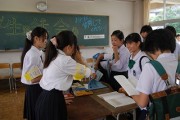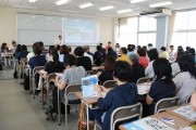 体験授業では各教科の教員が学びの楽しさを知ってもらえるような講座を行いました。中学校と比べて高校では,覚える量がたくさんになり大変ですが,それらを組み合わせて考えたり,自分の意見をまとめて発表したり等の機会が増え,勉強がおもしろいと思える瞬間がたくさんあります。そのためには特別な勉強をするよりは,いま学校で習っている教科書について,習っている内容の意味やおもしろさを感じながら,一生懸命頑張って身につけてください。