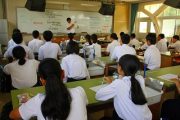 全体会①での校長挨拶、諸注意の後、授業見学で普段通りの青陵高校を見ていただきました。全体会②では、本校生徒による学校生活の紹介や各課からの説明、アメリカ研修プログラムの紹介などが行われました。